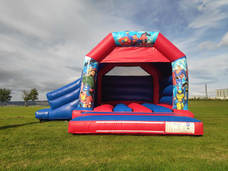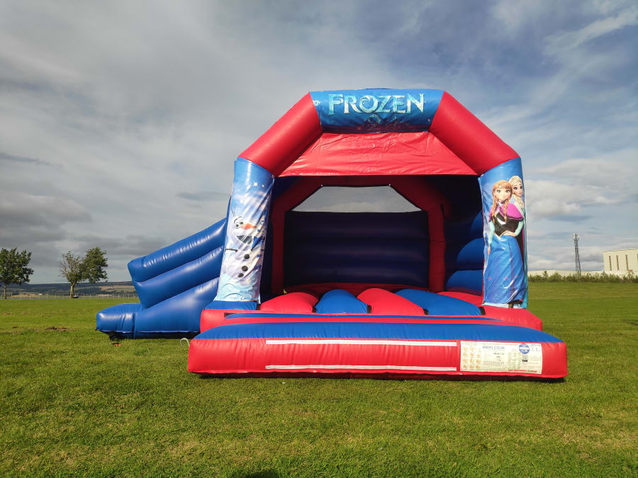 17ft x 15ft Bounce & Slide Disco artwork castle is a garden party classic with a slide. This castle has several interchangeable artworks and also can be set up with Disco Light & Speaker.