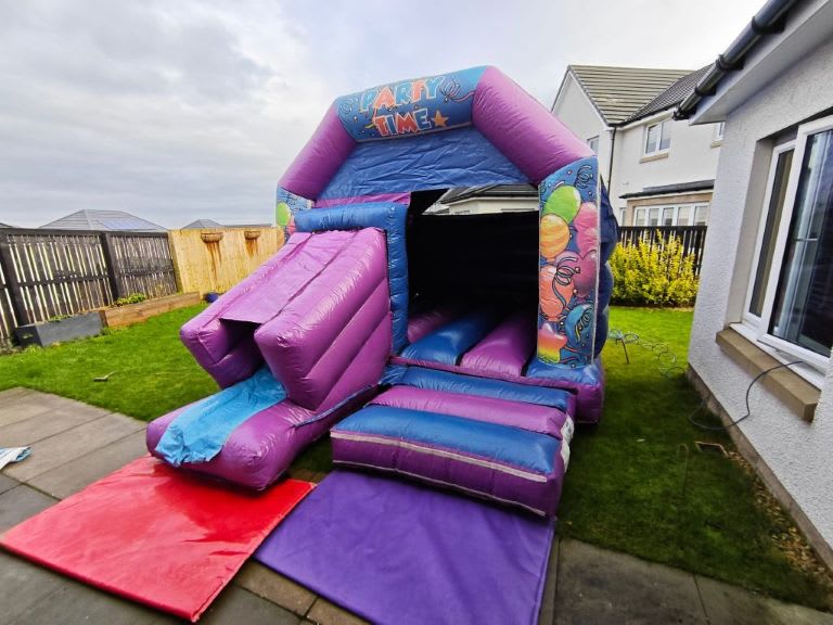 12ft x 18ft Bounce & Slide Purple Party castle is a garden party classic with a slide. This castle has several interchangeable artworks and also can be set up with Disco Light & Speaker.