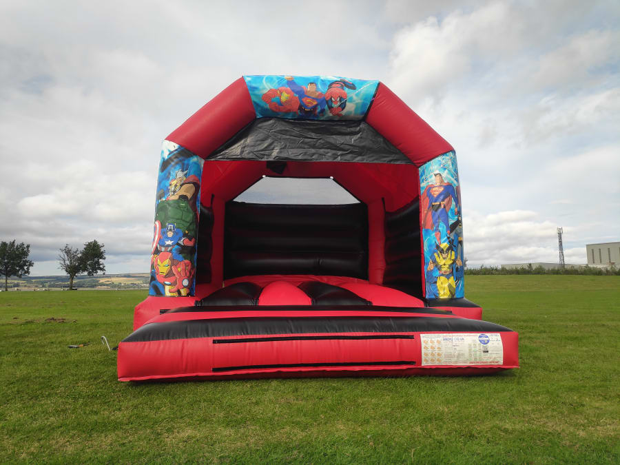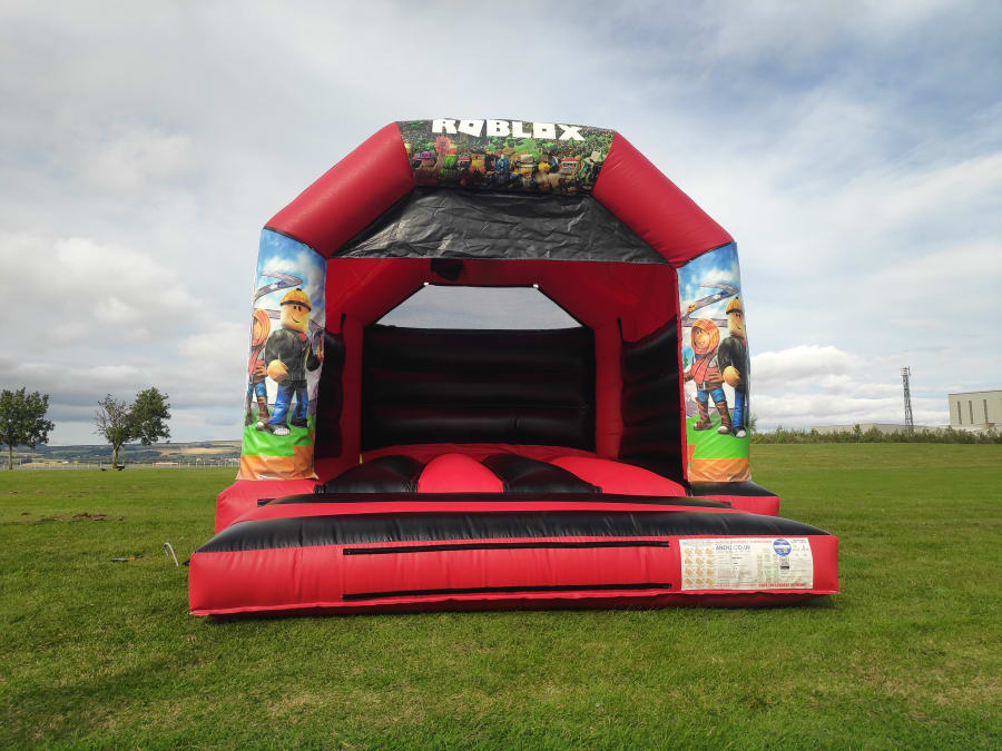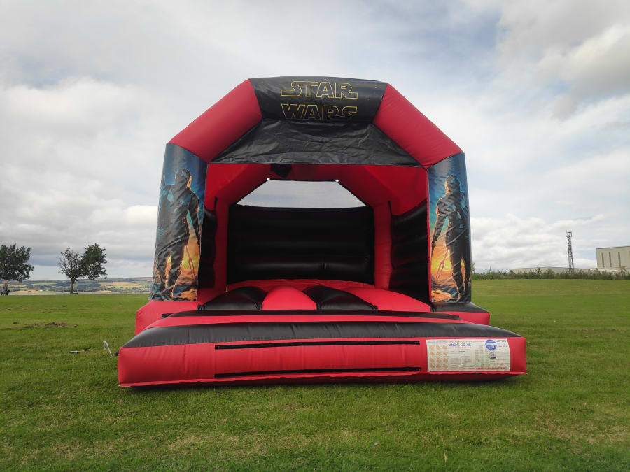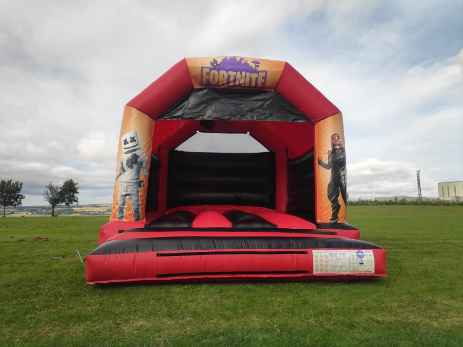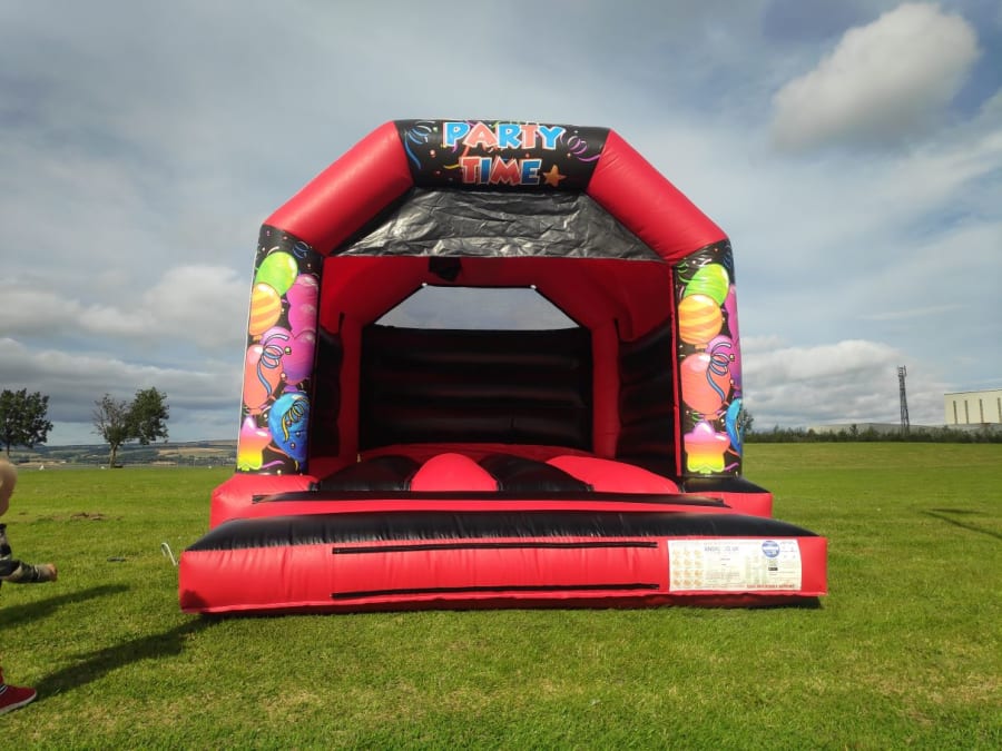 12ft x 15ft Red & Black Party Time bouncy castle is a garden party classic. This castle has several interchangeable artworks and also can be set up with Disco Light & Speaker.