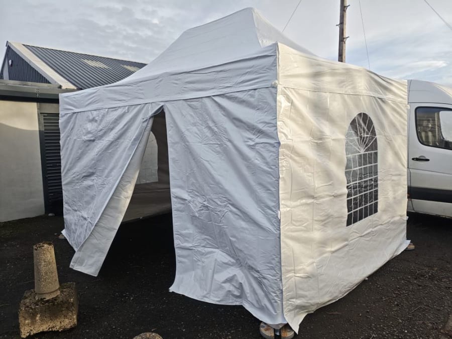 Looking for gazebo hire 3m x 4.5m White Gazebo in Glasgow, Paisley, Balloch, Helensburgh, Largs, Ayr, Kilmarnock, East Kilbride, Hamilton, Motherwell, Airdrie, Coatbridge, Strathaven, Kirkintilloch? Our 3m x 4.5m White Party Gazebo is polar oposite to our 3m x 4.5m Black Gazebo It’s ideal for private parties, summer garden parties, and outdoor events that need style and weather protection.