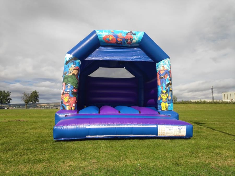 12ft x 15ft Blue & Purple Superhero bouncy castle.