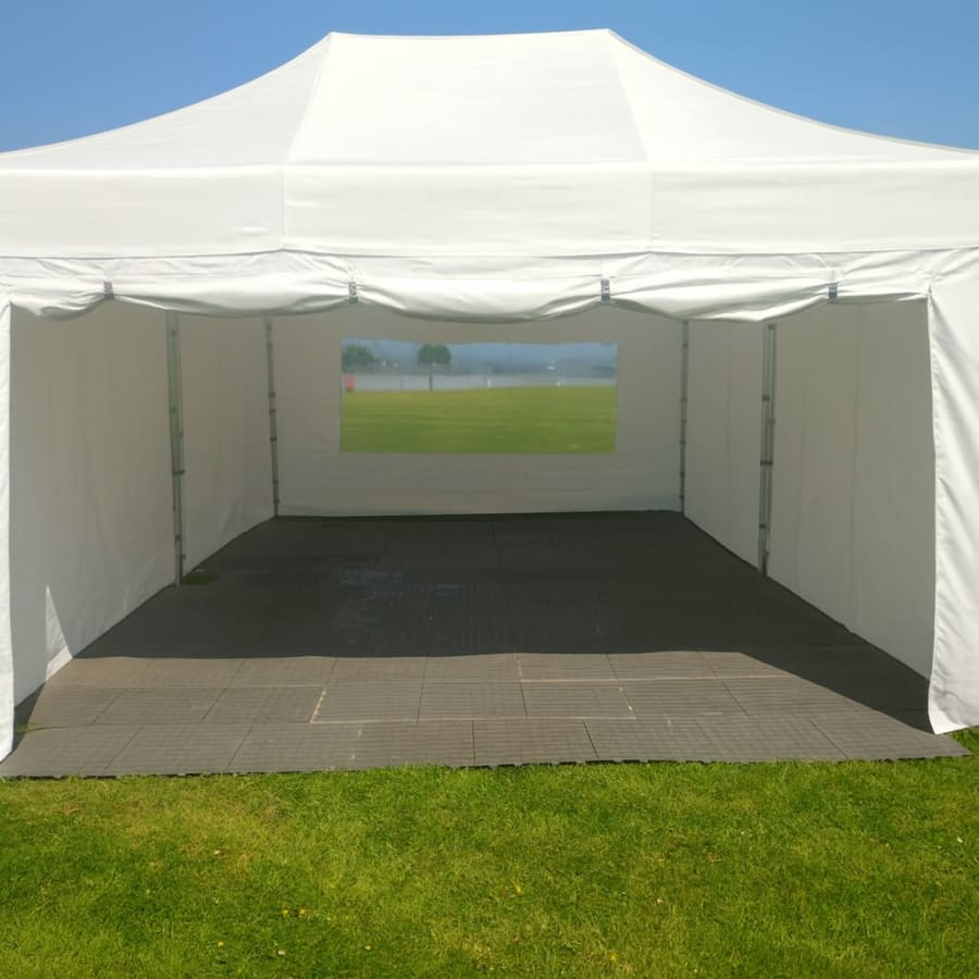 6m x 4.5m White Party Gazebo for times when 3m x 4.5m simply is not big enough. With Non-Slip Flooring for occasions when dry shoes and hard floor is essential.