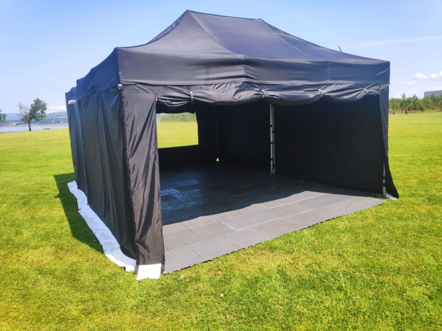 6m x 4.5m blackout Party Gazebo for times when 3m x 4.5m simply is not big enough. With Non-Slip Flooring for occasions when dry shoes and hard floor is essential.
